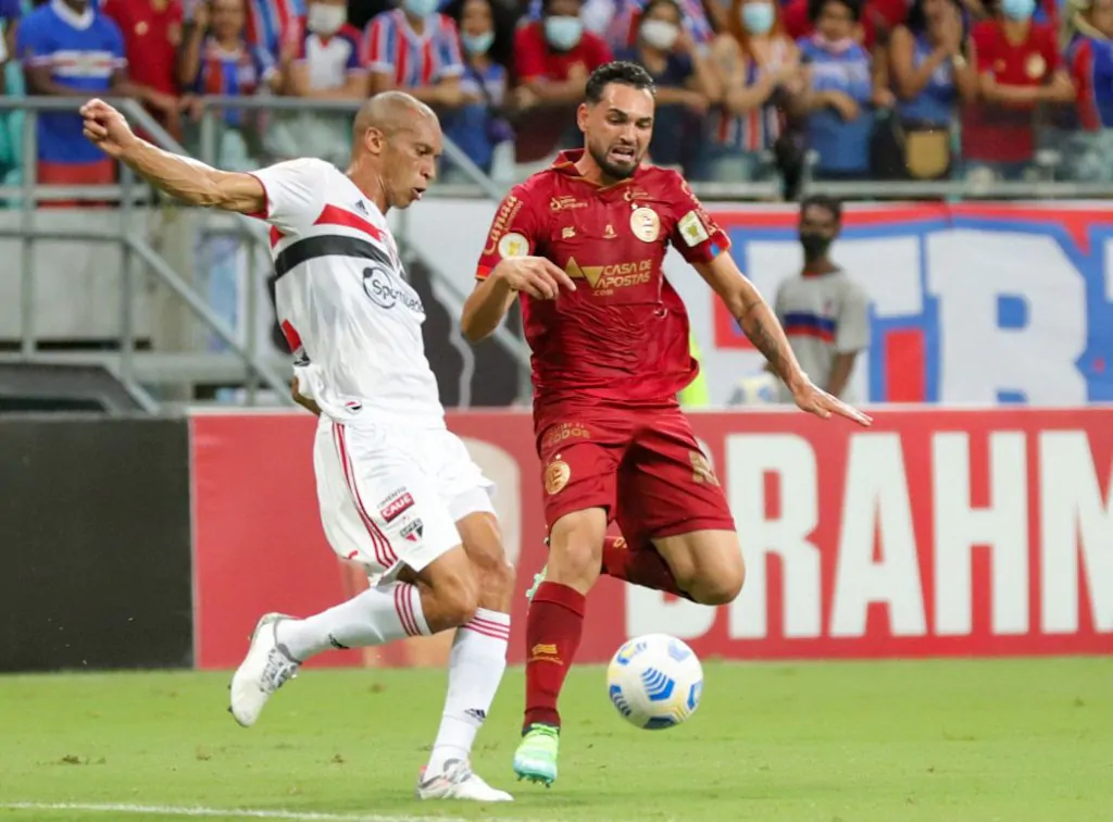 O jogo – O primeiro tempo foi truncado na Arena Fonte Nova, mas o Bahia acabou sendo superior. A primeira chegada do jogo foi do São Paulo, aos 10 minutos, em chute de Gabriel Sara para defesa de Danilo Fernandes. Depois, o Esquadrão de Aço teve as melhores ocasiões.