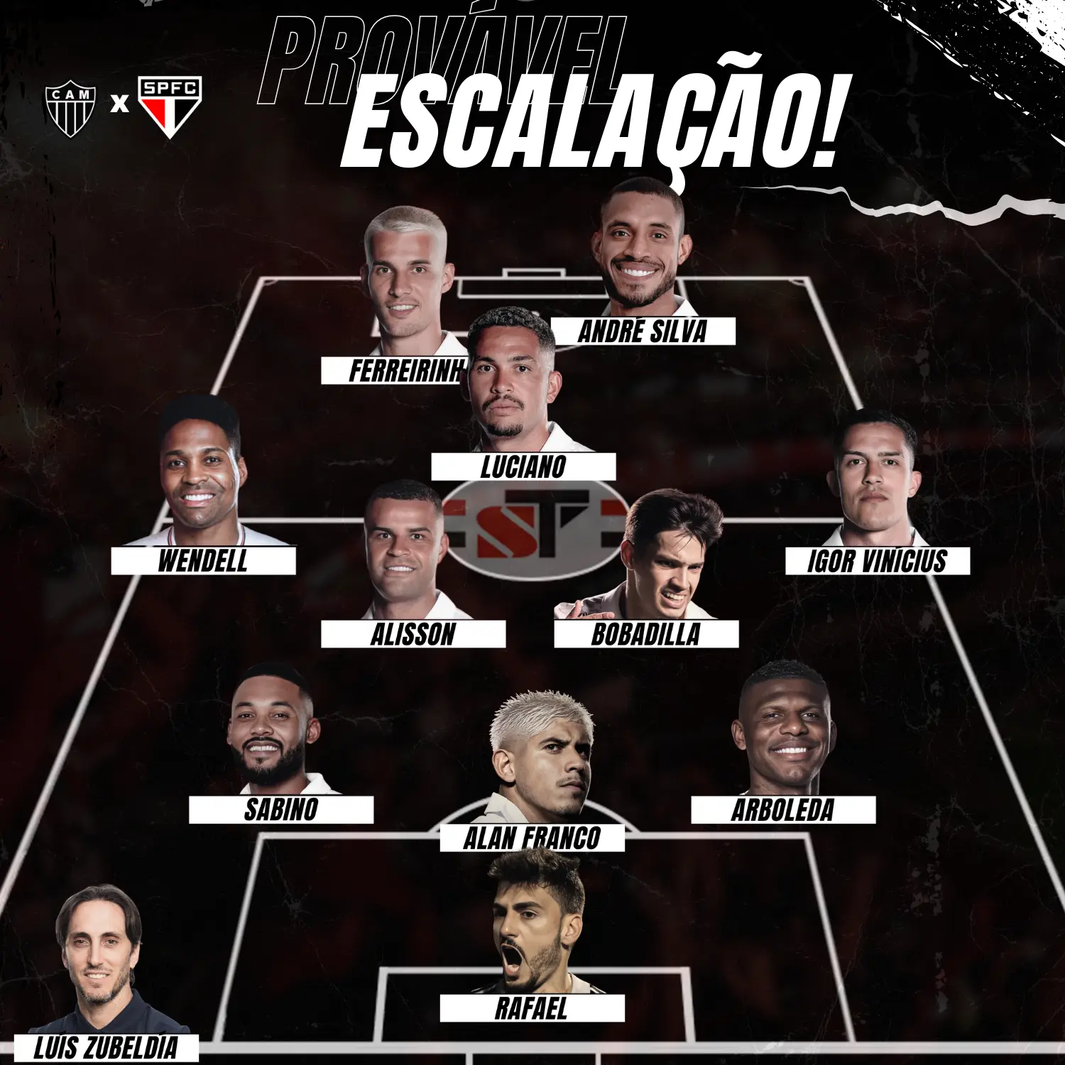 PROVÁVEL ESCALAÇÃO: Rafael; Ferraresi (Arboleda), Ruan e Sabino; Igor Vinícius, Marcos Antônio, Bobadilla, Alisson (Alves ou Negrucci) e Wendell; Luciano (Lucas Ferreira ou Ryan Francisco) e André Silva.