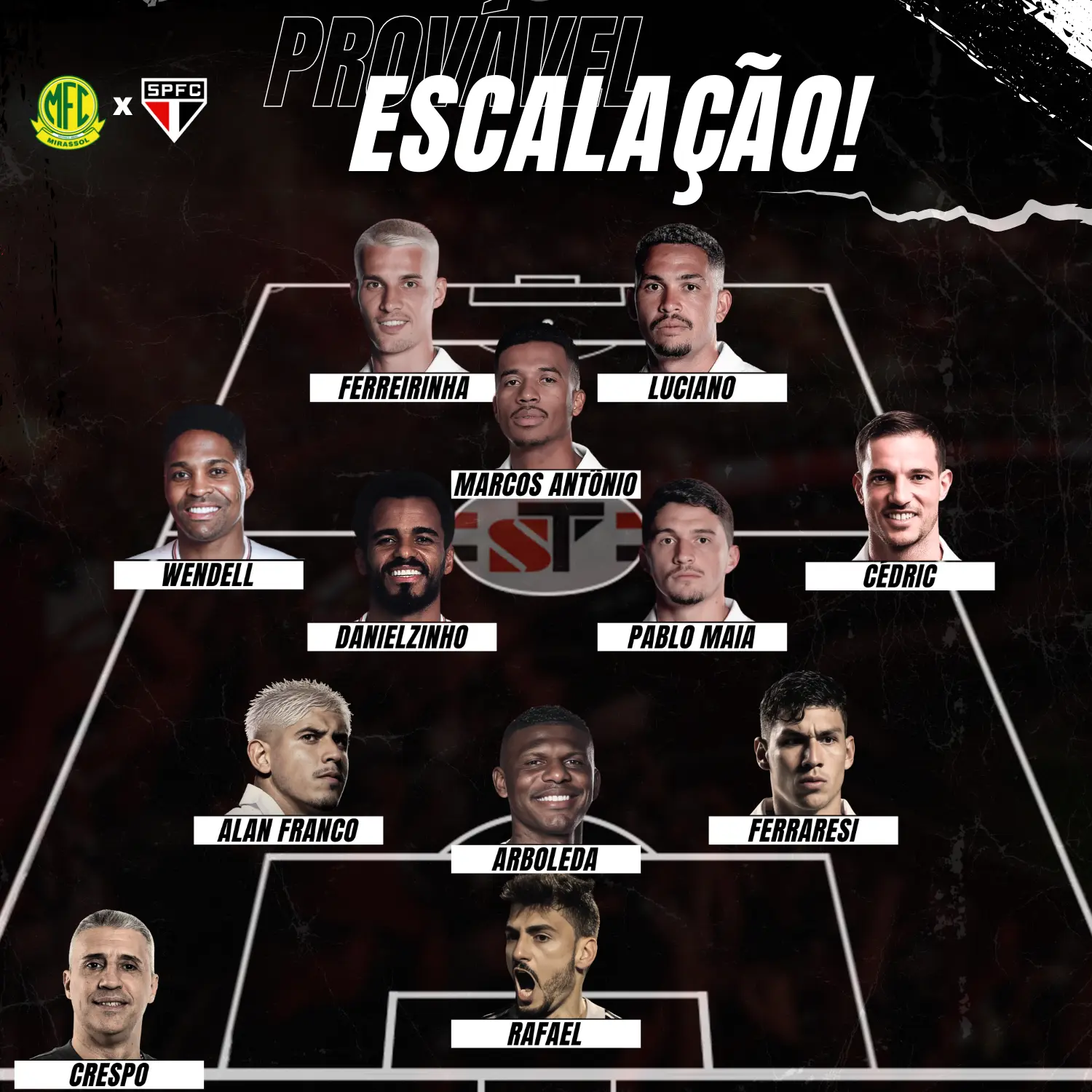 Apesar do retorno de Lucas Moura, Hernán Crespo terá muitos desfalques na estreia: Luan, Ryan Francisco e André Silva seguem no departamento médico, Enzo Díaz ainda treina com limitações, Rodriguinho não deve atuar por conta da negociação com o Red Bull Bragantino, e Calleri ainda não foi relacionado.