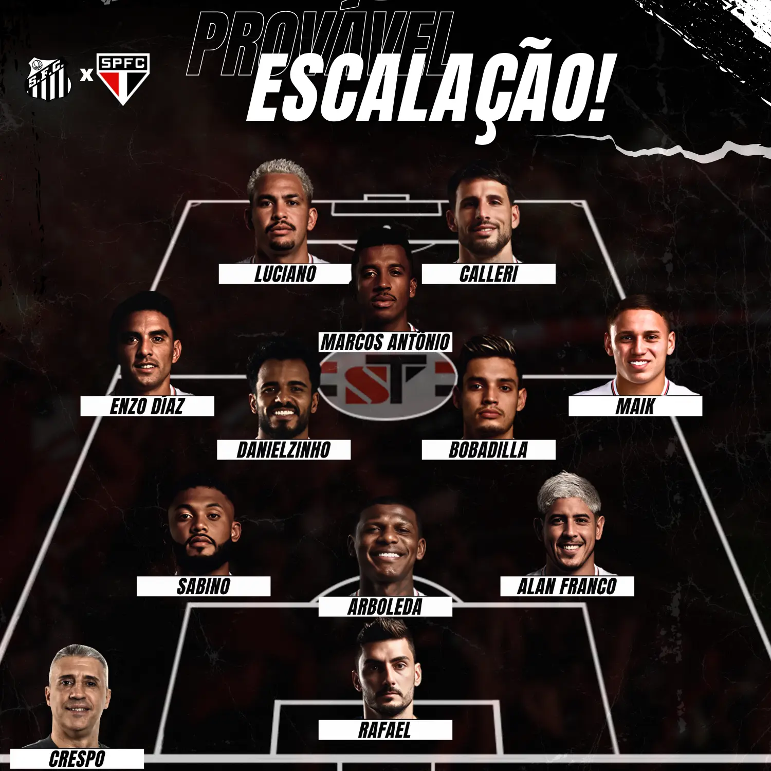PROVÁVEL ESCALAÇÃO: Rafael; Alan Franco (Dória), Arboleda e Sabino; Maik (Cédric), Danielzinho, Bobadilla, Marcos Antônio (Pablo Maia) e Enzo Diaz; Luciano e Calleri.