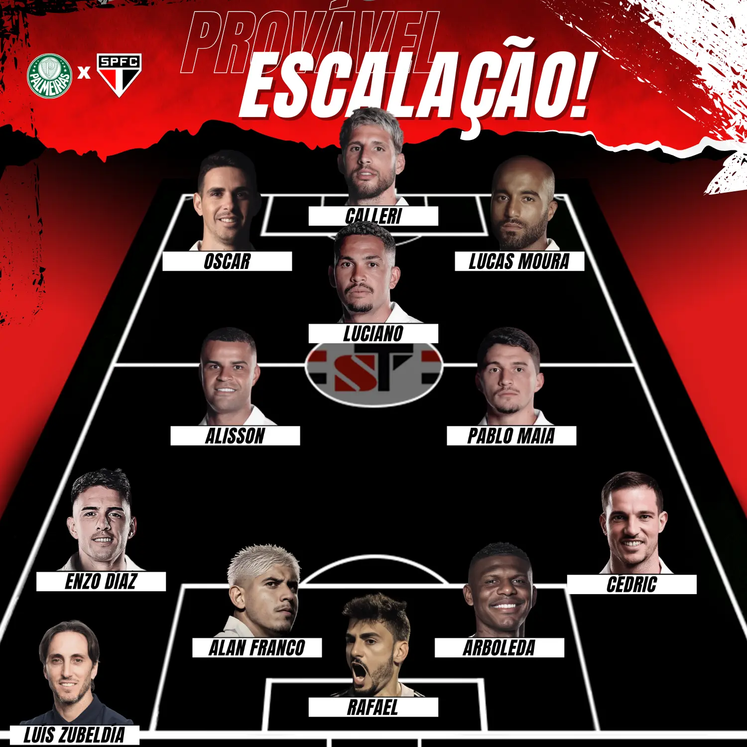 PROVÁVEL ESCALAÇÃO: Rafael, Cédric (Igor Vinícius), Arboleda, Alan Franco (Sabino) e Enzo Diaz; Pablo Maia, Alisson, Oscar e Lucas; Luciano e Calleri.