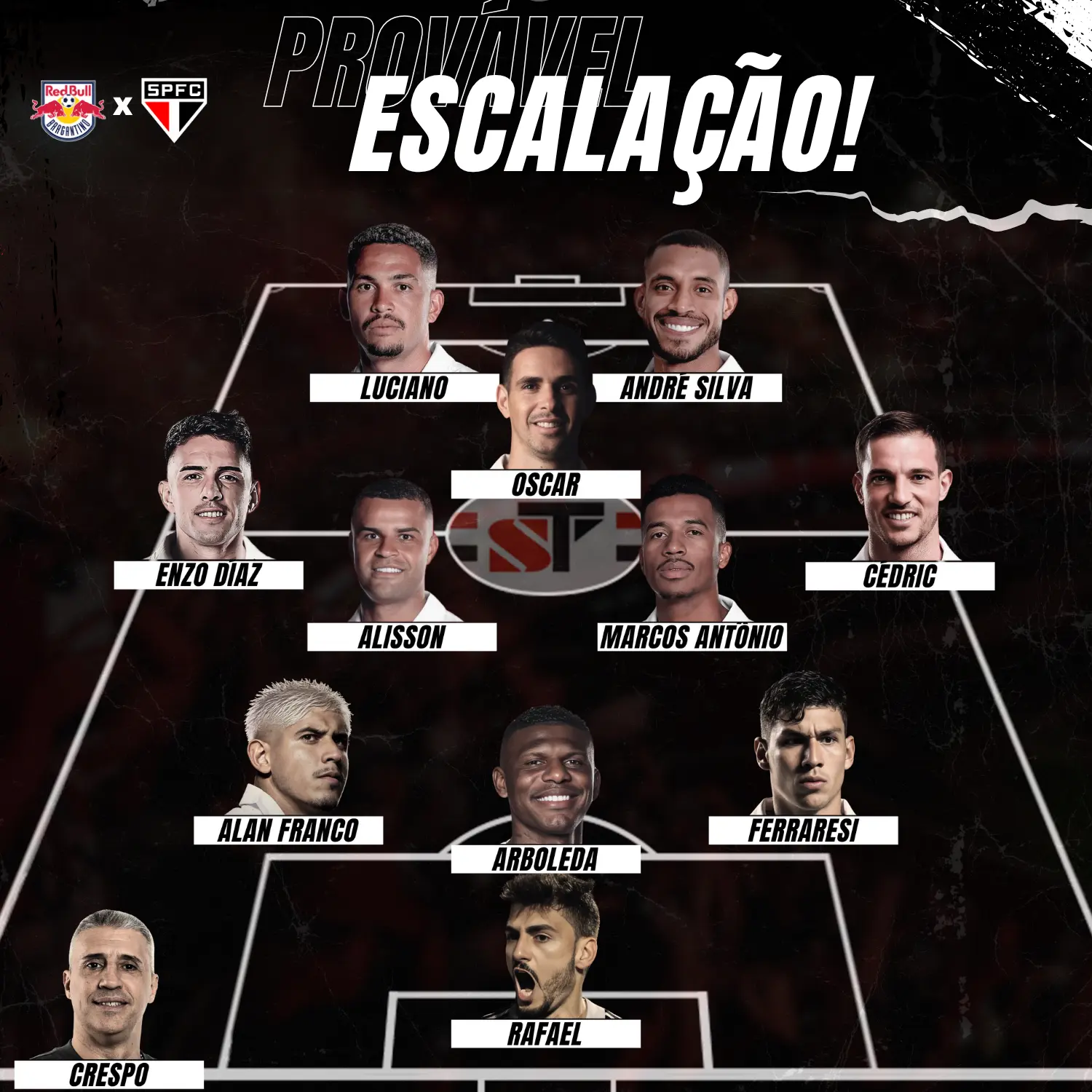 PROVÁVEL ESCALAÇÃO: Rafael, Ferraresi, Arboleda e Alan Franco; Cédric, Alisson, Marcos Antônio, Oscar e Enzo Diaz; Luciano e André Silva.