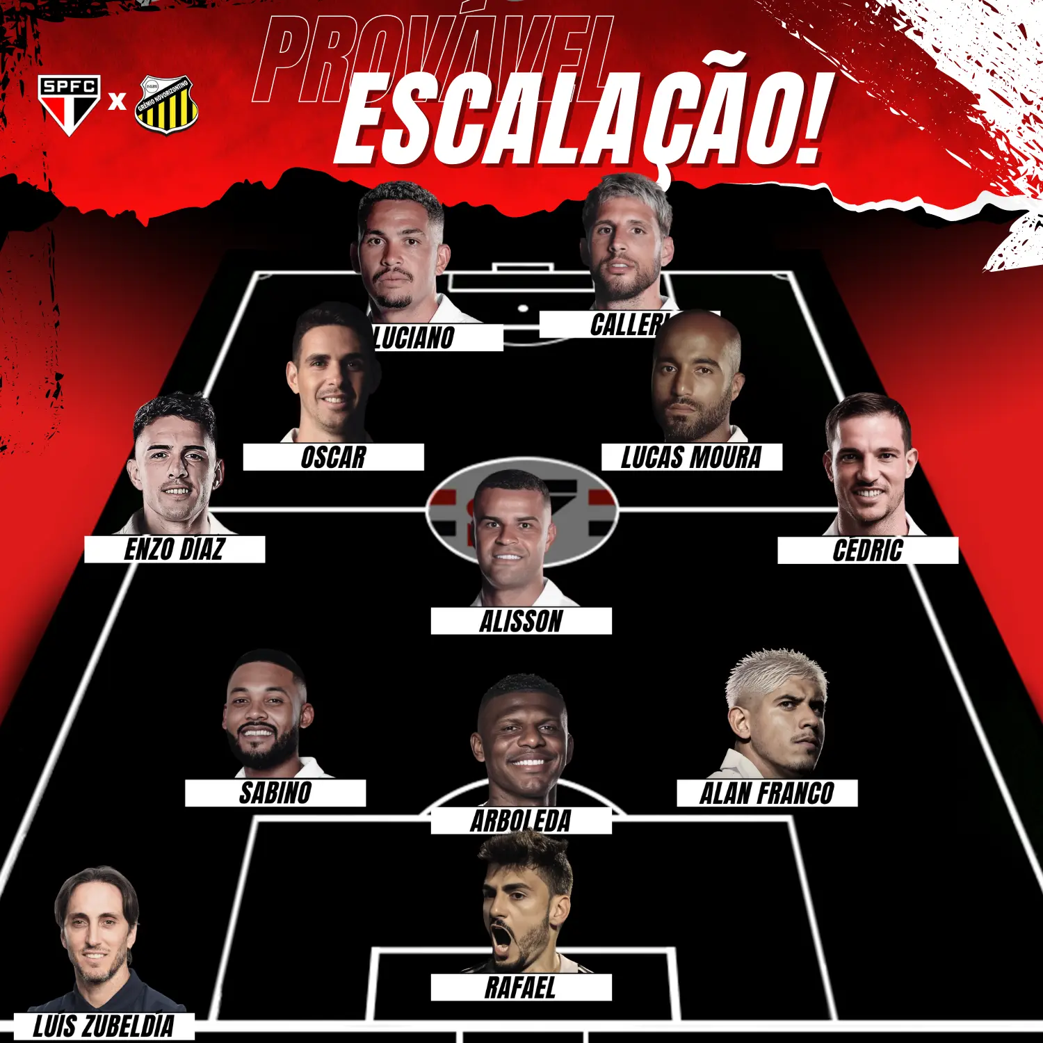 PROVÁVEL ESCALAÇÃO: Rafael, Alan Franco, Arboleda e Sabino; Cédric, Alisson, Marcos Antônio (Luciano), Oscar e Wendell; Lucas e Calleri (André Silva).