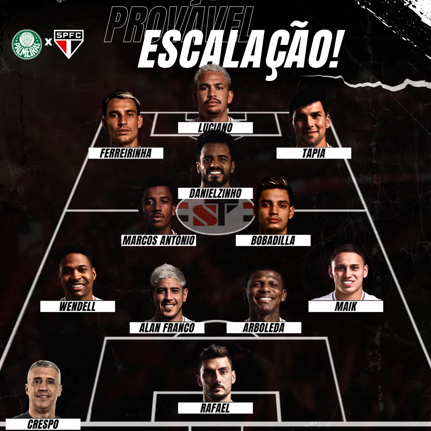 PROVÁVEL ESCALAÇÃO: Rafael, Maik, Arboleda, Alan Franco e Wendell; Marcos Antônio, Danielzinho e Bobadilla; Luciano, Tapia (Calleri) e Ferreira (Lucca).
